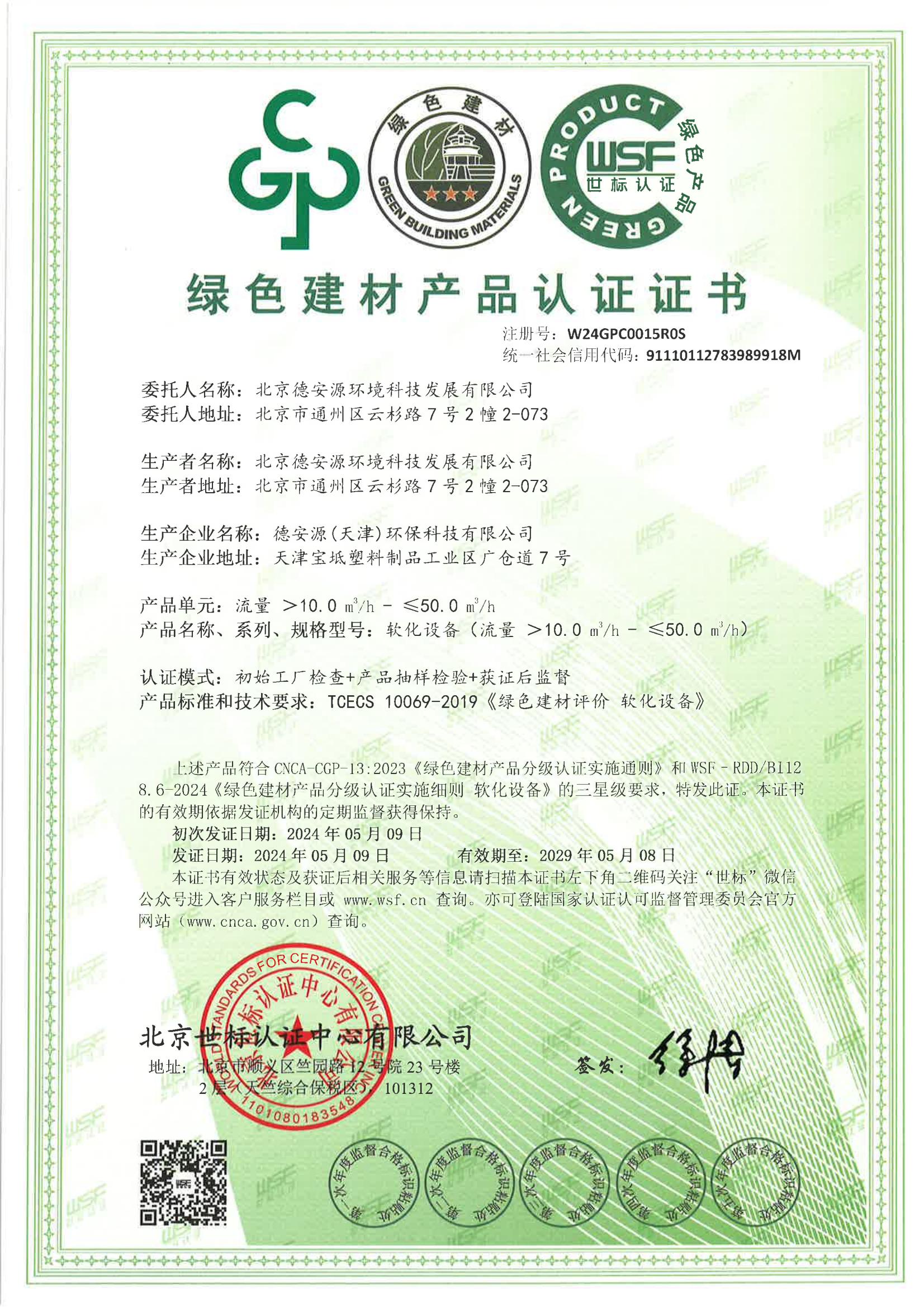 綠色建材產品認證證書-軟化設備(流量>10.0m3/h-≤50.0m3/h)