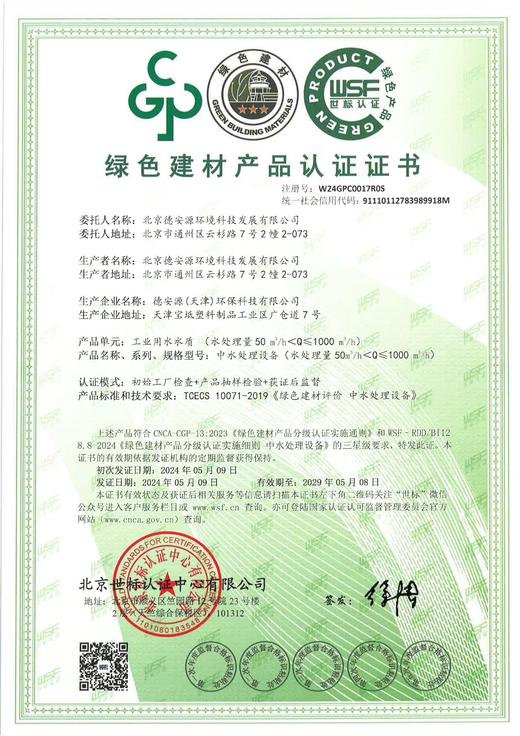 綠色建材產品認證證書-中水處理設備(水處理量50m3/h<Q≤1000m3/h)